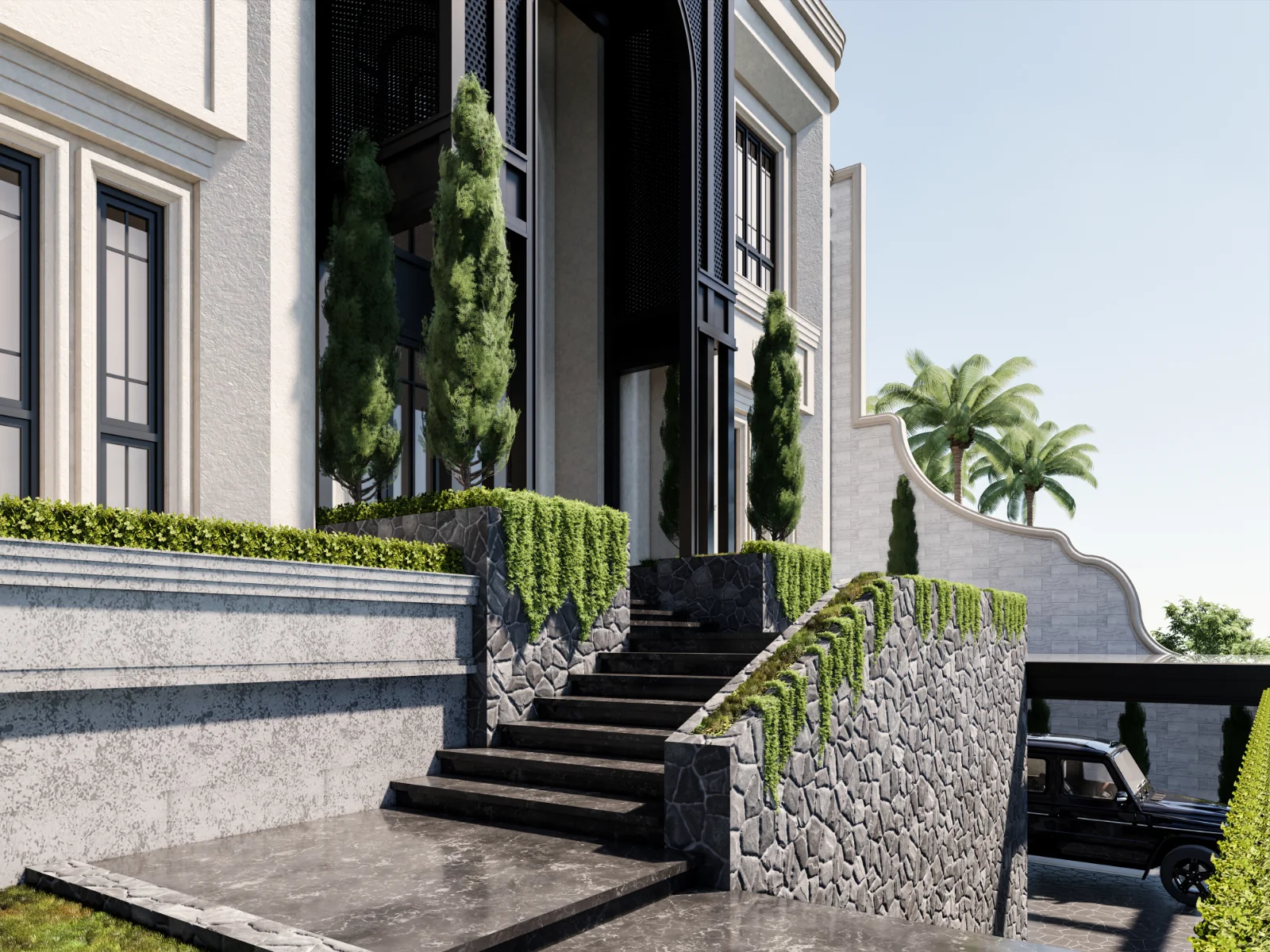 Rumah bertingkat tiga bergaya klasik–modern. Fasadnya simetris. Atap mansard (atap dua kemiringan, sisi bawah lebih curam) dipadukan dengan jendela dormer (jendela yang menonjol dari atap). Pintu masuk berbentuk lengkung setinggi dua lantai memberi aksen tegas. Ada pilaster (kolom pipih di dinding) dan lis cornice yang merapikan detail. Palet putih–abu dengan aksen gelap membuat tampilan bersih.